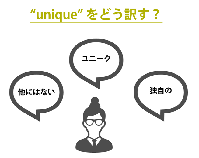 たとえば英日翻訳の場合、”It is unique.”と発話されれば、”unique”の持つ意味を正確に把握し、その場面に合った日本語をあてるという作業になります。ご存じの通り、”unique” には少なくとも「他にはない」「ユニーク」「独自の」といった意味があり、この中から最適な訳語を選択しなければなりません。