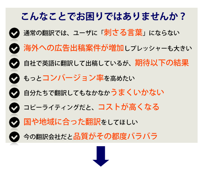 通常の翻訳では、コンバージョンを高めるだけの訳文を作れなかったり、逆にコピーライティングでは、魅力的な英文は作れますが、かなりコストが上がってしまい現実的には利用できないことがあります。